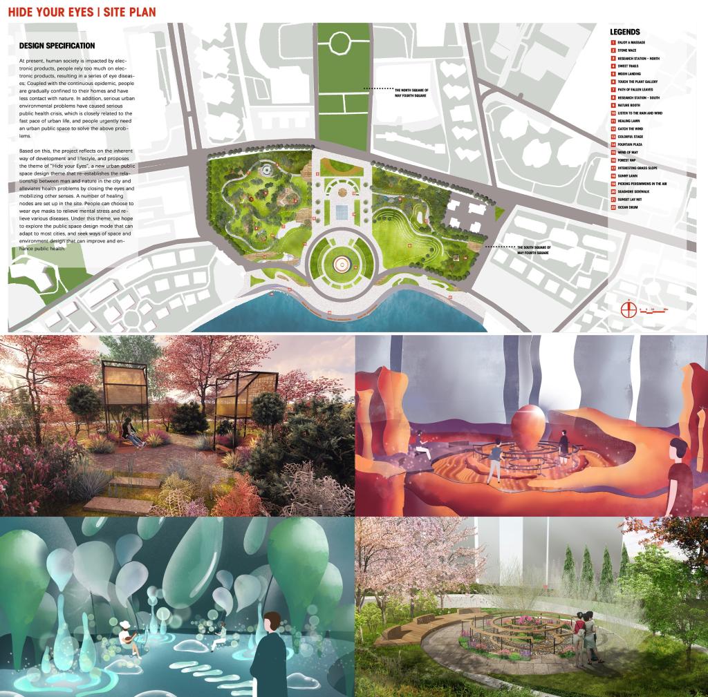 作品《HIDE YOUR EYES》选址在青岛市五四公园。以“放下手机,闭上眼睛,调动身体其他感官感受自然”为出发点,在城市公共空间中(以青岛五四广场周边绿地为例)打造一处“非视觉景观”,给城市公民一次“强制性”远离电子产品,重新回归自然的机会。在以盲人为主体的“非视觉体验大师”的指导下,在特殊设计的场地内进行除了视觉以外,多感知(听觉、嗅觉、触觉等)的游览体验。场地内空间多由具有康复性挥发物的中药植物进行营造,使城市公民在体验场地的同时,其各类慢性疾病得以治疗或缓解。