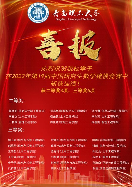 近日,“中国光谷·华为杯”第十九届中国研究生数学建模竞赛今日揭晓结果。我校研究生团结协作、勇于创新,获二等奖3项、三等奖6项。