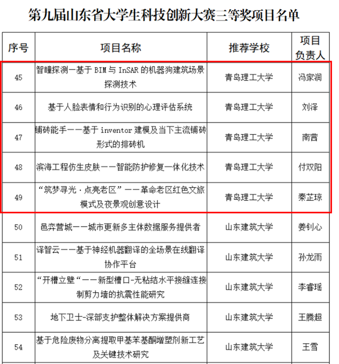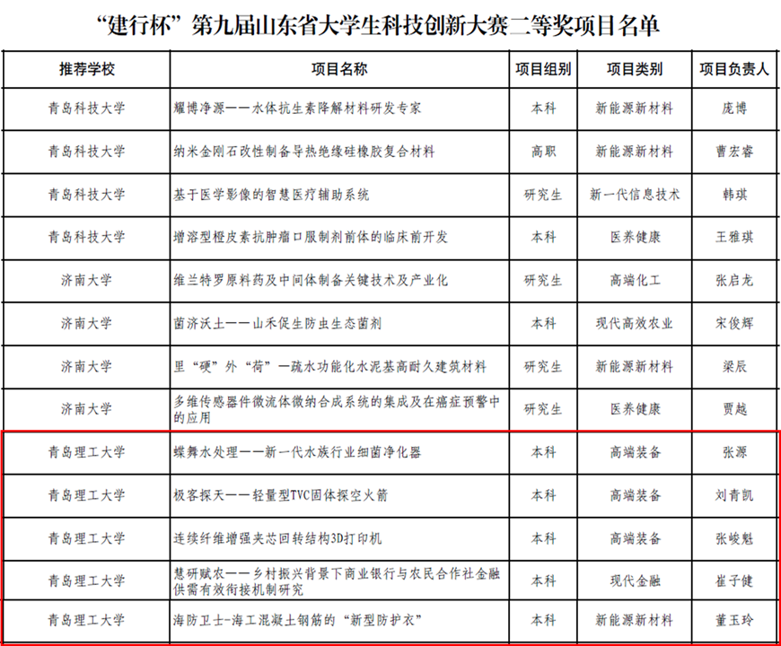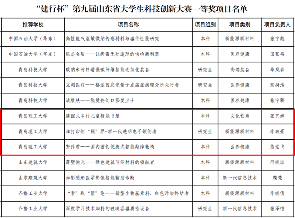近日,山东省教育厅主办的“建行杯”第九届山东省大学生科技创新大赛决赛落下帷幕。经过激烈角逐,我校建筑与城乡规划学院项目《装配式乡村儿童智能书屋》、机械与汽车工程学院项目《3D打印创“视”界-新一代透明电子领创者》、管理与工程学院项目《安伴君——国内首创便捷式智能越障轮椅》荣获一等奖。