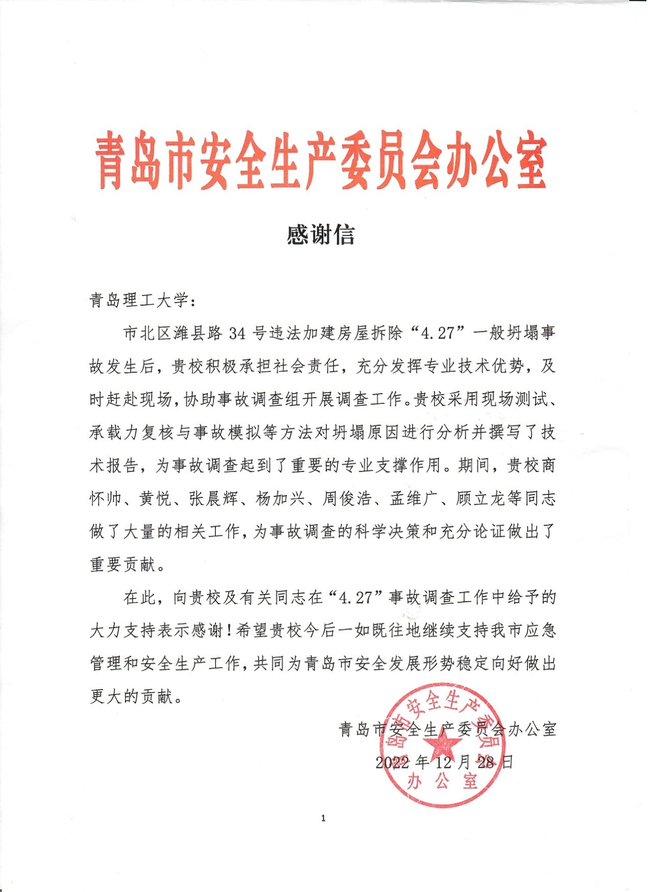 近日,青岛市安全生产委员会办公室发来感谢信,对我校土木工程学院商怀帅教授团队在市北区潍县路34号房屋拆除过程中坍塌事故原因技术调查中所作出的重要贡献表示感谢。