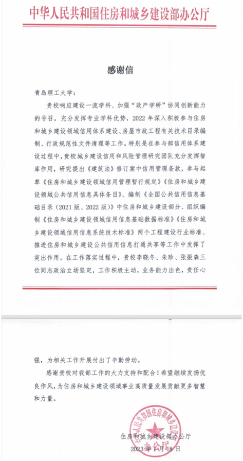 近日,永利集团3044官网欢迎您收到住房和城乡建设部办公厅发来的感谢信,对学校在2022年住房和城乡建设领域信用体系建设、行政规范性文件清理和房屋市政工程有关技术目录编制等工作中做出的积极贡献表达感谢。尤其对学校城乡建设信用和风险管理研究团队在信用体系建设中发挥的智库作用予以肯定,对管理工程学院李晓冬副教授、张振森副教授及土木工程学院朱珍老师在相关工作中表现出的精湛业务能力和积极工作态度予以表扬。