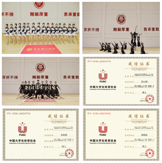 近日,2022年中国大学生啦啦操线上赛成绩揭晓,学校啦啦操健美操队获甲组集体爵士自选动作第一名、双人爵士自选动作第一名、集体花球自选动作第三名,叶明亮老师获优秀教练员荣誉称号。