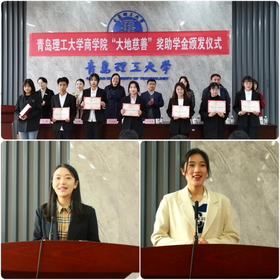 获奖代表栾铭雨、王瑞颖依次发言,表达了对山东大地公益慈善基金的感谢以及对学校学院栽培的感激之情,表示将以实际行动践行“百折不挠、刚毅厚重、勇承重载”的理工精神和“勇毅明理、笃学弘商”的商院内涵,担负起新时代的历史使命。同时,也向全体获奖同学发出倡议要将“大地慈善”的精神内涵传递下去,让大地充满爱。