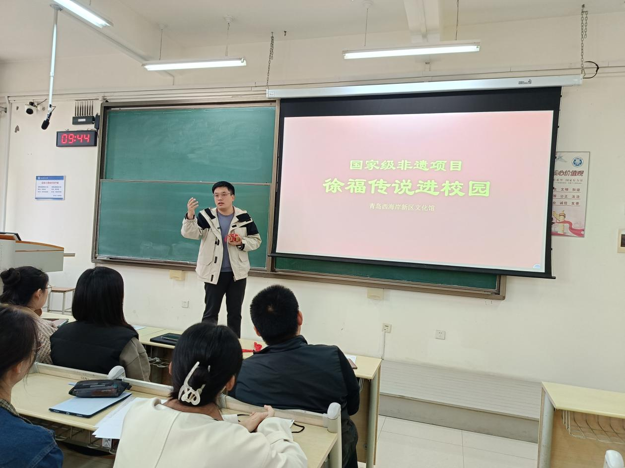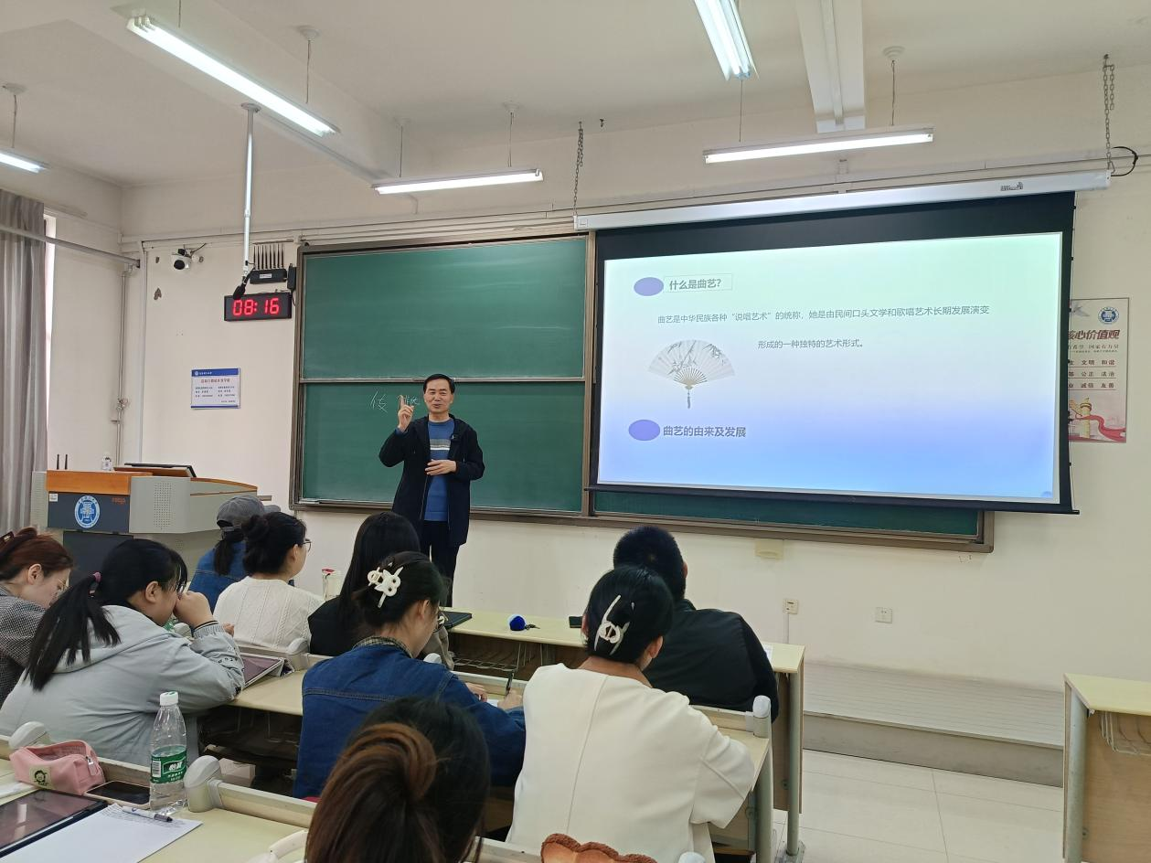 4月18日,国家一级相声演员、山东省曲艺家协会主席团委员、东营市曲艺家协会主席陈建民,青岛西海岸新区文化馆曲艺干部、山东省曲艺家协会会员丁盛华到我校人文与外国语学院,在校级一流课程《中国民俗文化》课堂上,为汉语言文学专业同学分享中华优秀传统文化——曲艺文化。此次活动为青岛西海岸新区文化馆、区非遗保护中心2023年度“非遗进校园”活动的一部分。活动由课程主讲教师、副教授张成福主持。