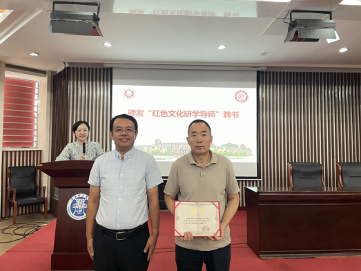 以报告会为契机,高洁向铁流和与会师生介绍了信息与控制工程学院红色文化研学实践开展情况,重点推荐并播放学院筑梦合唱团暑期红色研学成果原创音乐视频《沂蒙新唱》,视频展现了新时代沂蒙精神和人民群众为建设美好生活而不懈努力的精神风貌。学院聘请铁流担任红色文化研学导师,指导学院红色研学实践等方面工作,曲良波为铁流颁发了聘书。