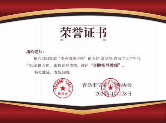 经过青岛市百余位选手激烈角逐,我校师生用真挚的语言、生动的故事表达对祖国的热爱、对家乡的赞美,充分展现了当代大学生和市民的爱国情怀和演讲艺术风采并喜获佳绩。成人组高正瀚老师、贾婉琦老师获得一等奖;研究生组邹硕、孙旭彤、王丁同学获一等奖;赵子豪、杨淼、查怡、张永喜同学获二等奖;本科生组刘绪佳、罗琛、张淦博同学获得一等奖;张凯月、李佳乐、蔡香岐、李福侁同学获得二等奖。永利集团3044官网欢迎您工会获得了“优秀组织单位”奖,潘玲荣获“金牌指导教师”奖!