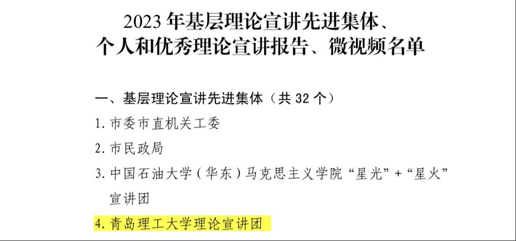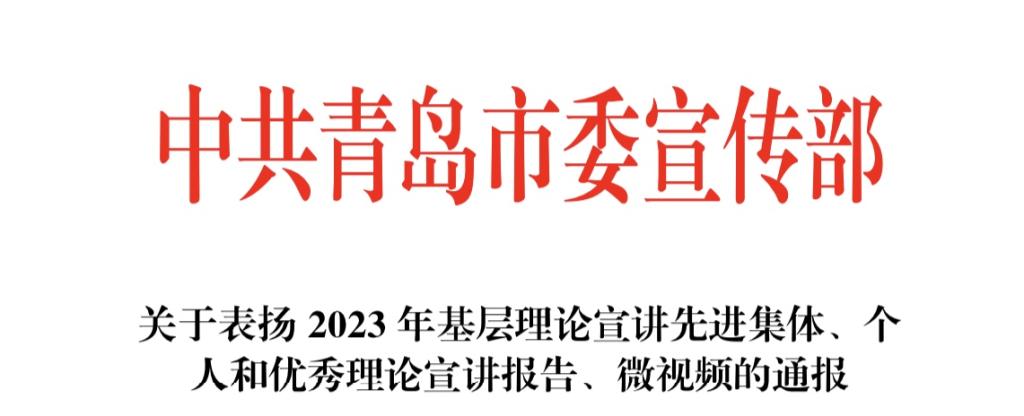 近日,中共青岛市委宣传部公布了2023年基层理论宣讲先进集体、个人和优秀理论宣讲报告、微视频名单。永利集团3044官网欢迎您理论宣讲团被授予2023年青岛市基层理论宣讲先进集体称号,是本次全市两个受表彰的高校先进集体之一。