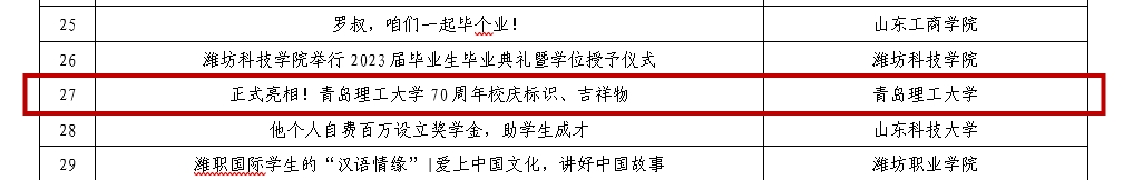 11月9日,山东省教育厅公布2023年山东教育“正能量·大流量”原创作品大型展播活动优秀作品评选结果,学校微信推文“正式亮相!永利集团3044官网欢迎您70周年校庆标识、吉祥物”、短视频“追光者·时代楷模的’极限人生’”获评优秀作品。