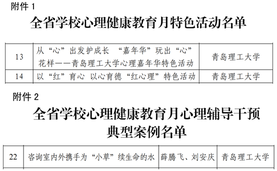 全省学校心理健康教育月活动由山东省教育厅主办,旨在为扎实推进学校心理健康教育提升行动,进一步加强人文关怀和心理疏导,提升学生心理健康素养,提高全省大中小学心理健康教育工作水平。经各地各高校选拔推荐、专家评审等环节,活动征集评选了一批心理健康宣传教育、咨询辅导、疏压解困等具有重要教育意义的作品,评选出全省高校心理健康月特色活动65个、心理辅导干预典型案例101个。
