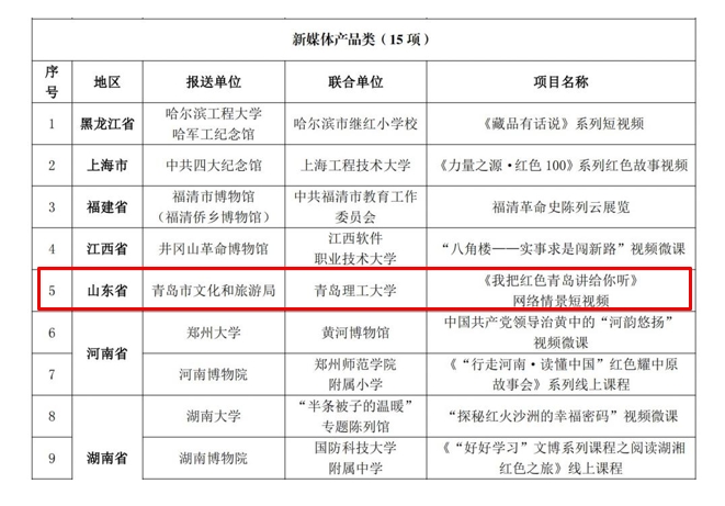 11月22日,国家文物局办公室、教育部办公厅联合印发通知,公布了以革命文物为主题的“大思政课”优质资源项目名单,确定了 10 个示范项目、100个精品项目。我校人文与外国语学院、青岛市文化和旅游局联合打造的《我把红色青岛讲给你听》网络情景短视频被评为新媒体产品类优质资源精品项目,是此次入选的全国100个“大思政课”精品项目之一。