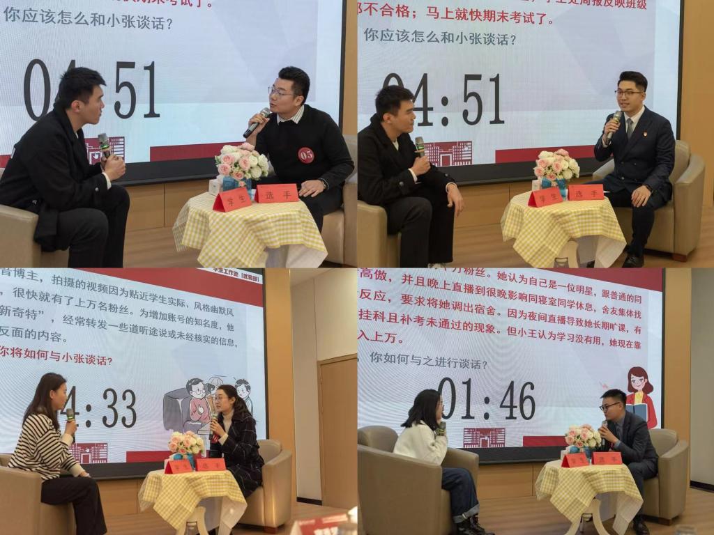 “谈心谈话”比赛,现场还原真实案例,结合辅导员日常工作内容,从学生思想理论教育和价值引领、学生日常事务管理、大学生心理健康教育、职业规划与就业创业指导等方面还原现实谈话场景,参赛辅导员们结合工作实践经验,熟练运用谈心谈话技巧,引导谈话对象正确认识并合理解决学习生活中遇到的各种问题。参赛选手沉着应对,以良好的精神面貌、较高的知识素养、过硬的心理素质,熟练运用谈心谈话技巧,引导谈心谈话学生正确认识问题、分析问题、解决问题,充分彰显了我校辅导员的职业风采和职业素养。
