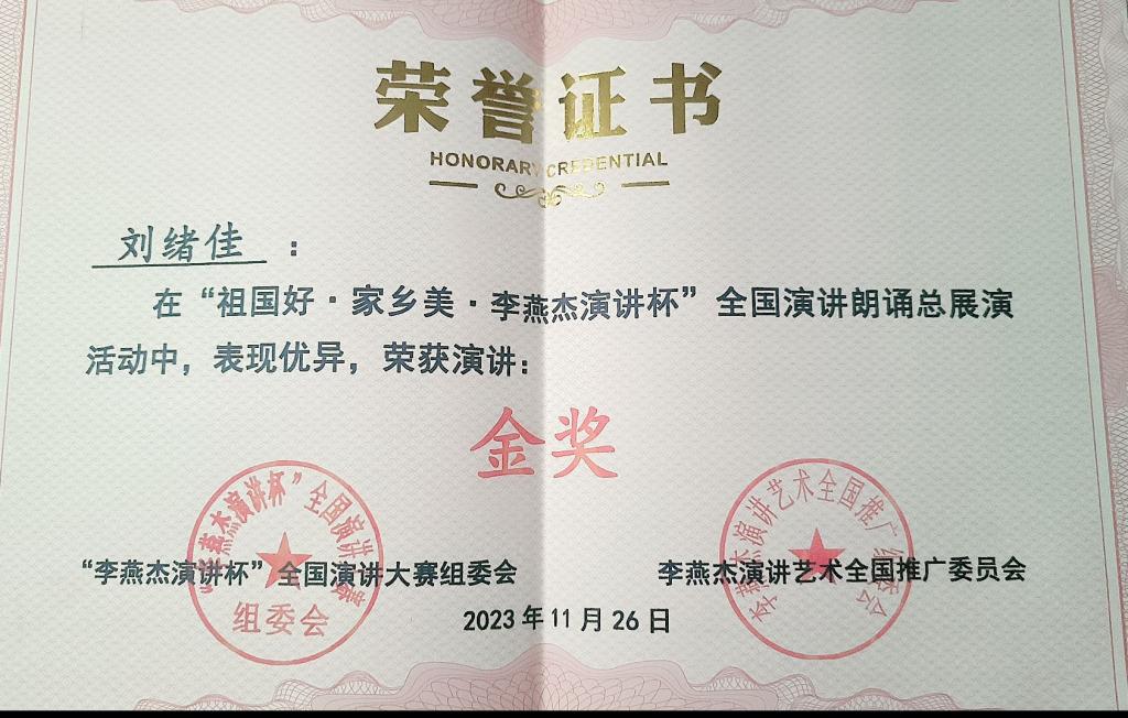 为庆祝中华人民共和国成立74周年,传承中华优秀文化,宣传中国红色文化,讲好中国故事,传播中国好声音;为纪念并弘扬中国演讲泰斗、共和国演讲家李燕杰教授的大爱精神和演讲艺术,本次大赛聚焦于“祖国好 家乡美”,致力于发扬爱国精神。经过数月准备以及校内赛的激烈角逐,我校选手刘绪佳进入全国总展赛大学生组比拼。大赛采取线上评分的方式,刘绪佳在比赛中展现出了极高的综合素质和演讲能力,弘扬爱国主义精神,赞颂中华民族之脊梁,以“鹰”贯穿全文,声情并茂地讲述家乡名人李苦禅的故事,在演讲“大我”同时不忘联系“小我”,充分展现了自己的自信和魅力,赢得了评委肯定,最终获得大学生组金奖的好成绩。