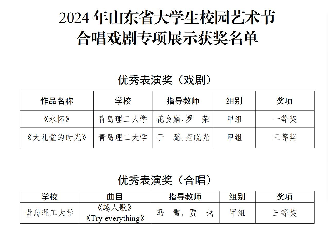 近日,山东省教育厅公布了2024年山东省大学生校园艺术节合唱戏剧专项展示活动获奖名单,我校学子斩获佳绩,荣获一等奖1项、三等奖2项,获奖数量位居驻青高校前列。